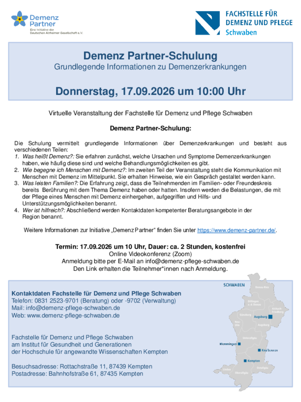 | Veranstalter | Fachstelle für Demenz und Pflege Schwaben |