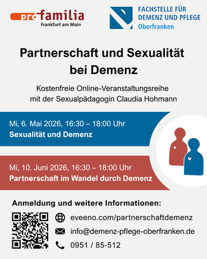 Jeweils mittwochs, am 6. Mai sowie am 10. Juni 2026, von 16:30 bis 18:00 Uhr, lädt die Fachstelle für Demenz und Pflege Oberfranken ein zu zwei kostenfreien Online-Vorträgen rund um die Themen Sexualität, Partnerschaft und Pflege im Kontext von Demenz. Referentin beider Termine ist Claudia Hohmann, Sexualpädagogin und Leiterin der Beratungsstellen von pro familia Frankfurt.